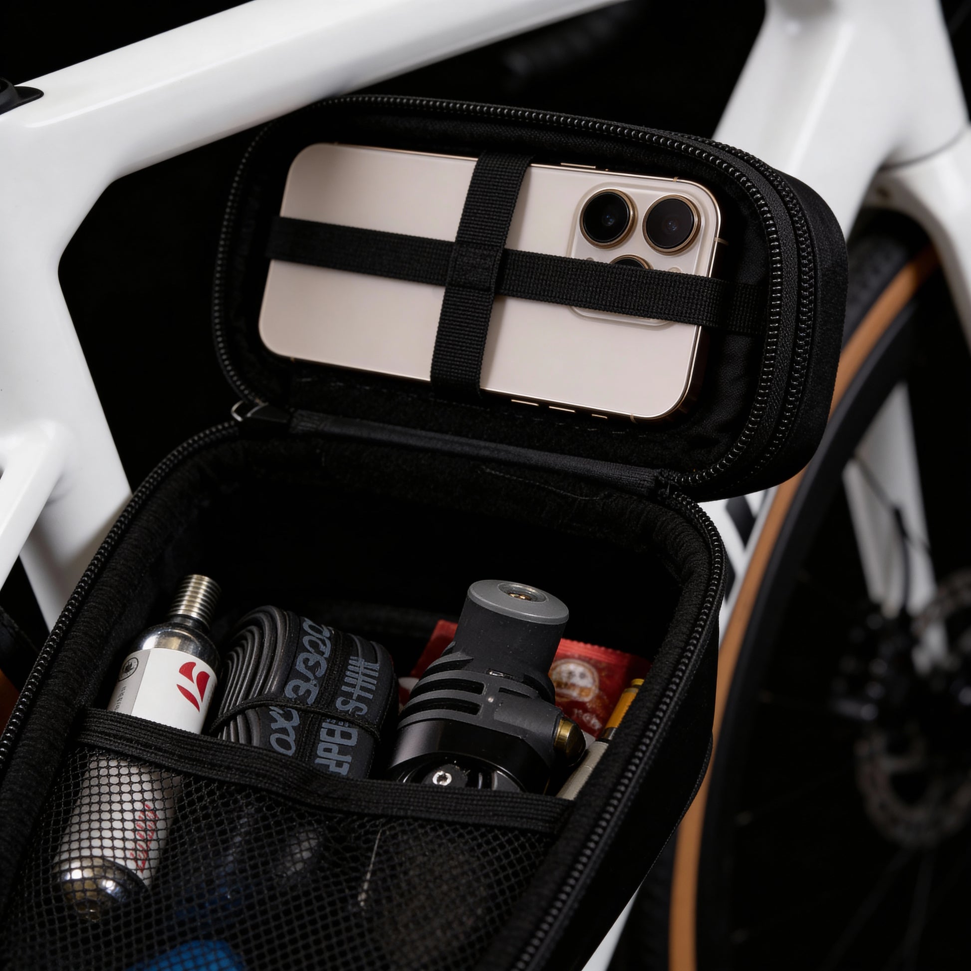 Espace optimisé pour téléphone, clés, portefeuille, lunettes, gels énergétiques et petits accessoires.